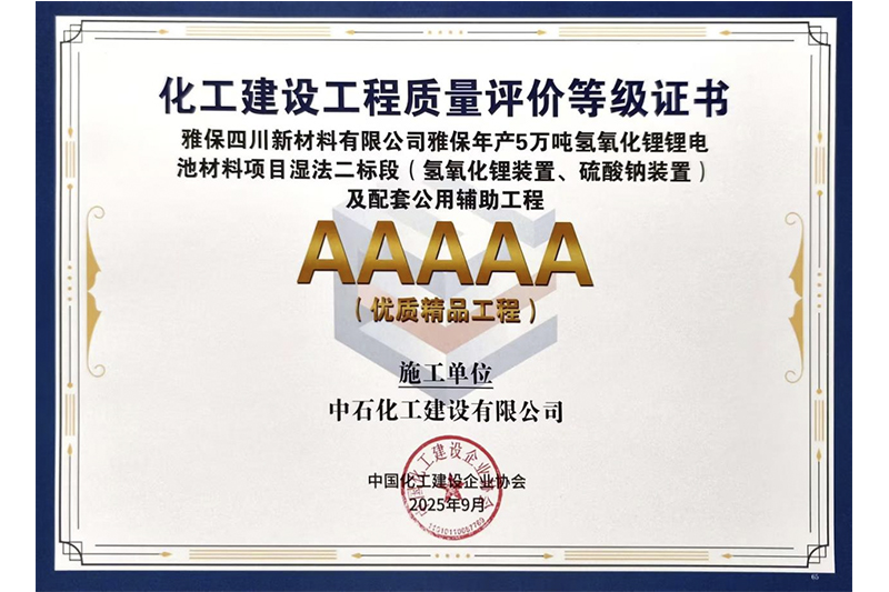 近日,经中国化工建设企业协会组织专家委员会综合评价,由公司承建的雅保四川新材料有限公司雅保年产5万吨氢氧化锂锂电池材料项目湿法二标段 (氢氧化锂装置、硫酸钠装置)及配套公用辅助工程荣获2025年度中国化工建设企业协会“5A”级优质精品工程,杭钱塘工出【2022】32号绿色高效植保产品建设项目荣获中国化工建设企业协会“4A”优质工程。