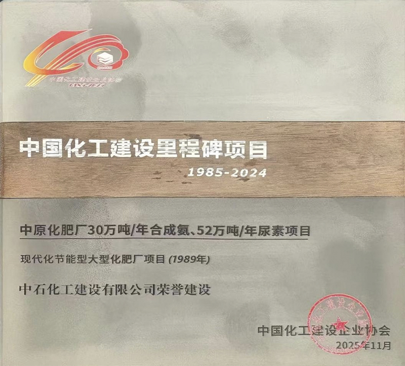 11月30日,中国化工建设企业协会正式授予公司承建的中原化肥厂30万吨/年合成氨、52万吨/年尿素项目——“中国化工建设里程碑项目”,以表彰其在行业发展中的标志性价值与深远影响。